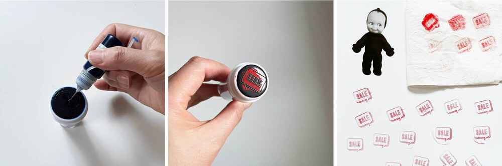 ❶ 스탬프의 패드가 보이도록 거꾸로 세운 후 글씨 면에 잉크가 살짝 덮이도록 한두 방울씩 떨어뜨려 흡수시킵니다.