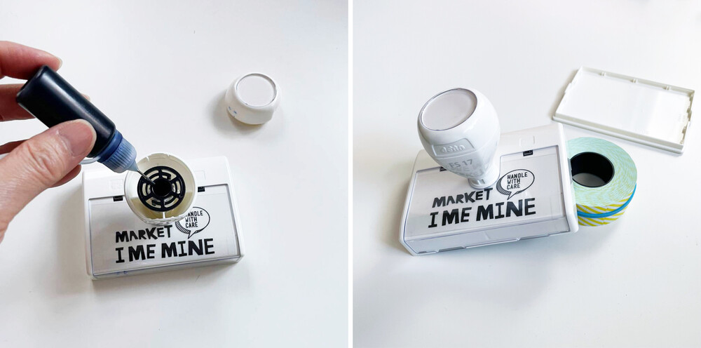 ❶ 손잡이 부분의 뚜껑을 열고 스탬프가 찍힌 상태에 따라 적게는 몇방울! 많게는 주르륵! 잉크를 리필해 줍니다.